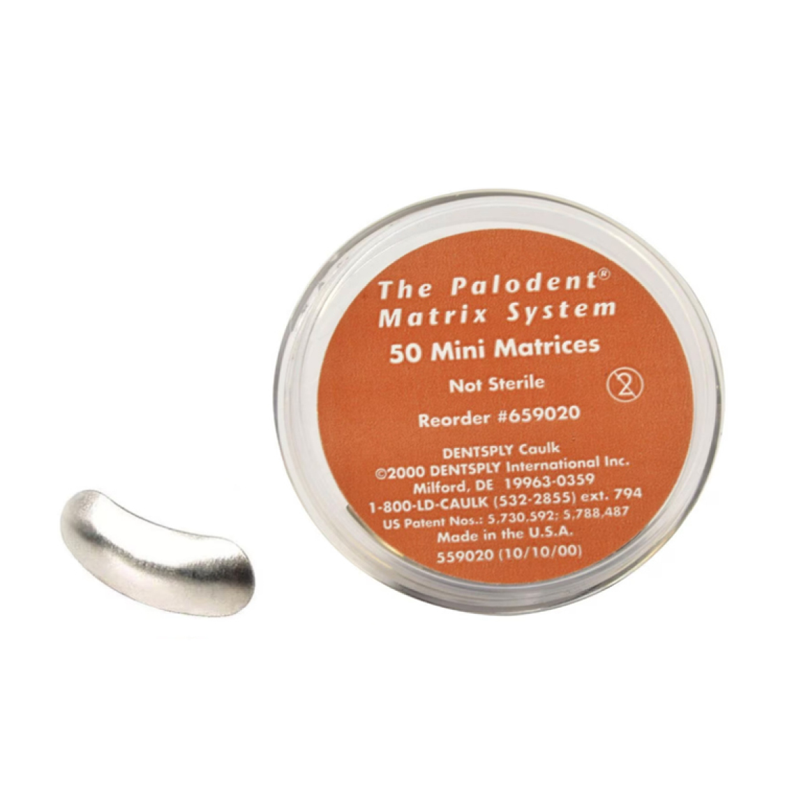 Sistema di matrici Palodent Dentsply. Sistema di matrici sezionali con anelli di ritenzione per ottenere punti di contatto ottimali. La forma della matrice Palodent crea contorni e profili naturali, agevolando il raggiungimento di contatti interprossimali perfetti nei restauri di Classe II.