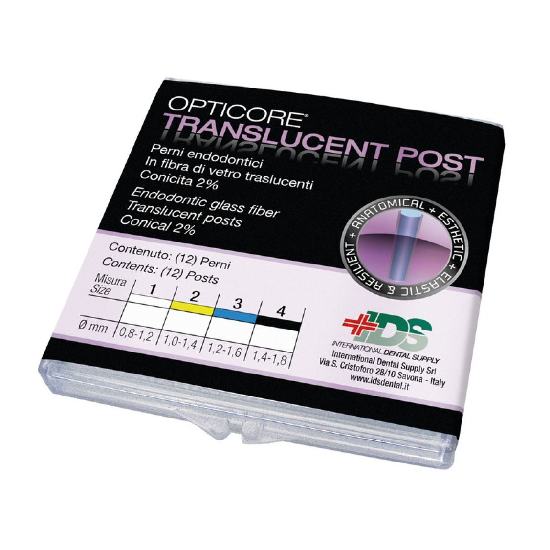 Perni endocanalari tralucenti in fibra Tri-Glass. Indicati per ricostruzioni dirette perno-moncone. Hanno una conicità del 2% per un adeguamento anatomico del canale radicolare, minimizzando così la riduzione dei tessuti dentinali per l’alloggiamento del perno.