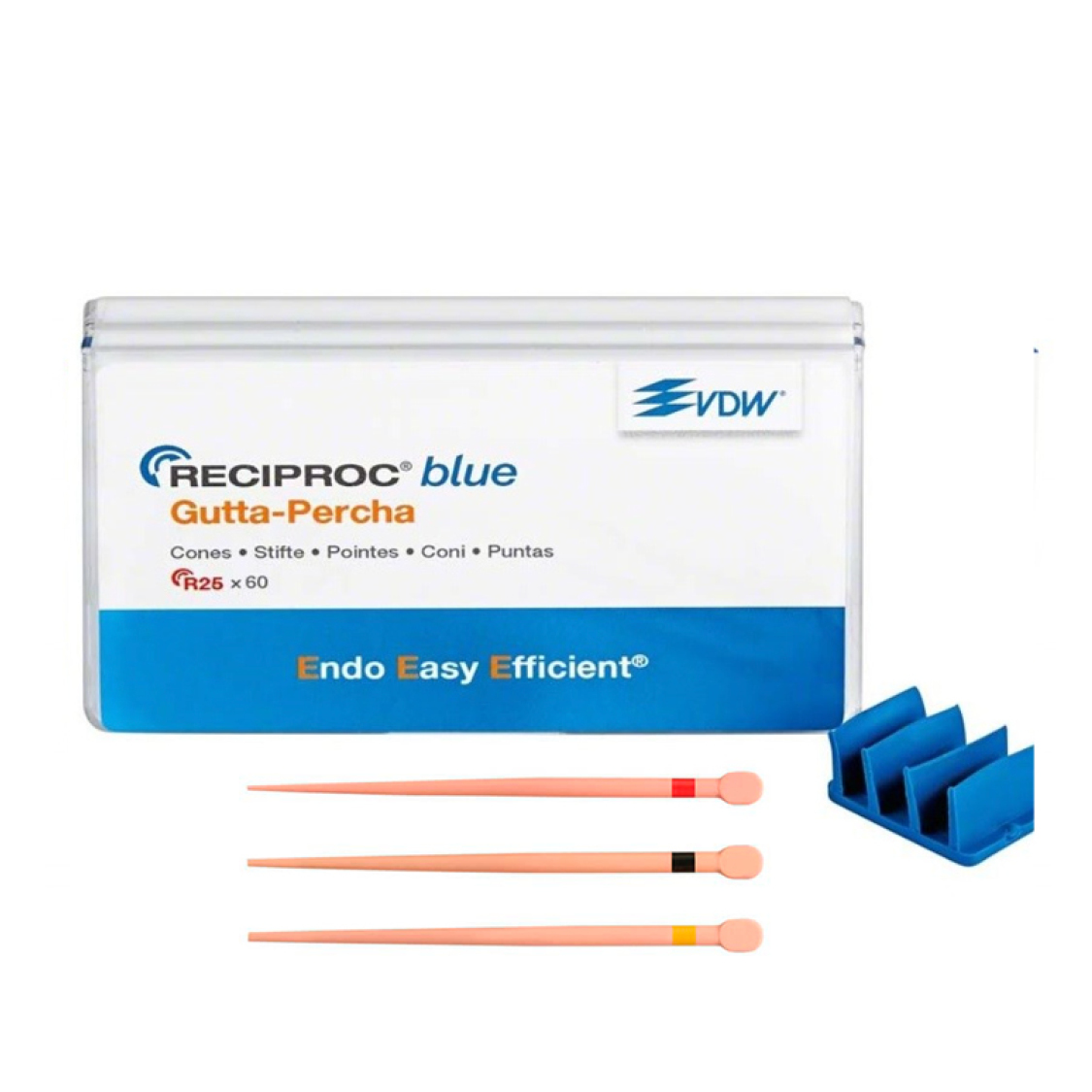 Punte di guttaperca precise, preformate meccanicamente, con conicità variabile, che si adattano perfettamente ai condotti preparati con RECIPROC® blu. Nuova formula: Guttaperca micronizzata, a 4 mm dalla fonte di calore ha una temperatura di lavoro da 105°C a 180°C.