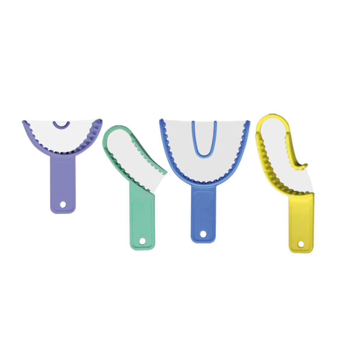 Portaimpronte 3 in 1. Impronta della mandibola superiore e registro del morso. Risparmio di tempo: con una sola impronta si avrà l’impronta di mandibola inferiore, superiore e occlusione. Risparmio di materiale. Comodo per il paziente: piú veloce e meno riflesso di nausea. Materiale centrale speciale, trasparente e resistente allo strappo. Forma stavbile con manico rinforzato. Codice di colori per facilitare l’identificazione velocemente.
