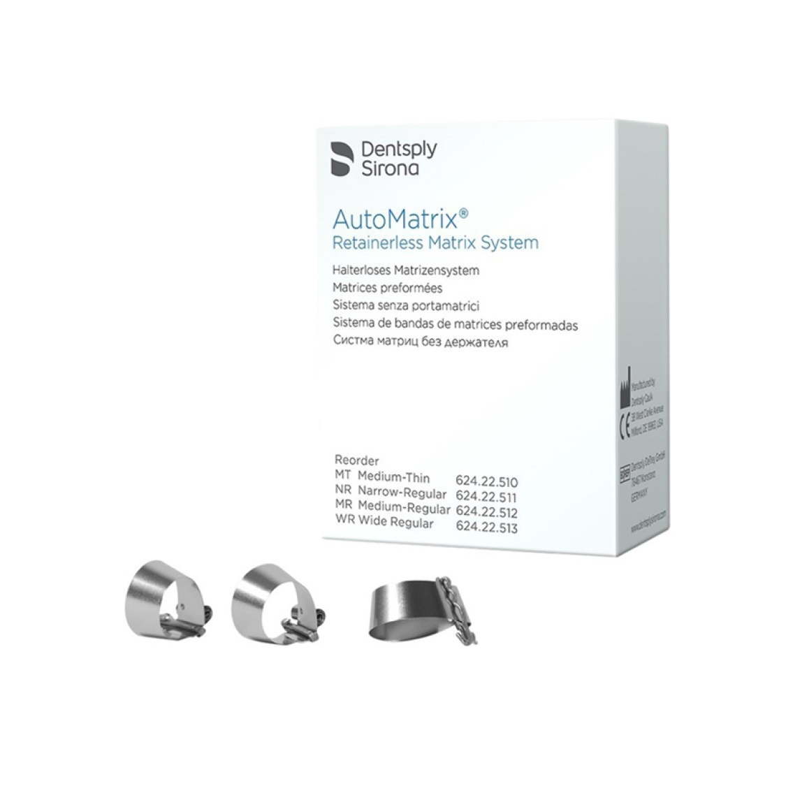 Il sistema AutoMatrix consente il posizionamento e il mantenimento della matrice senza la necessità di ingombranti fermi, consentendo un'applicazione semplice, un migliore accesso, una migliore visibilità del campo operatorio e un maggior comfort per il paziente. L'uso singolo e il sistema di bande circumferenziali AutoMatrix consente un corretto adattamento subgengivale e prossimale. Il sistema di matrici AutoMatrix è disponibile in quattro altezze/larghezze e spessori. Tutte le misure delle matrici del sistema AutoMatrix si adattano ai denti di qualsiasi circonferenza.