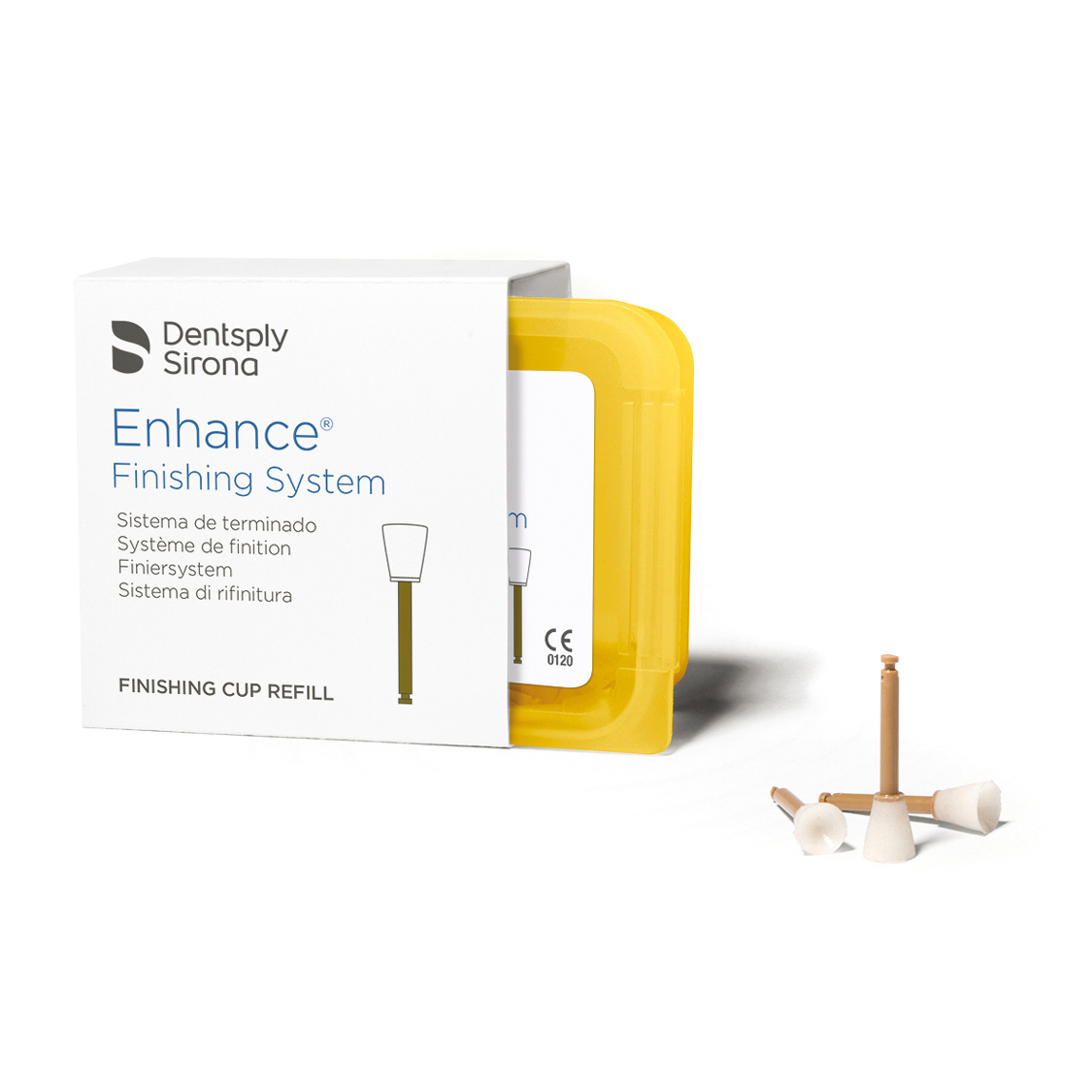 Sistema di lucidatura Enhance con 3 tipi di pezzi (disco, coppetta e punta) bagnati con una resina speciale e impregnati di abrasivo in superficie, utilizzato per la rifinitura e la lucidatura di tutti i tipi di composito, nonché di amalgame, vetroionomeri e compomeri. Sterilizzabile in autoclave.