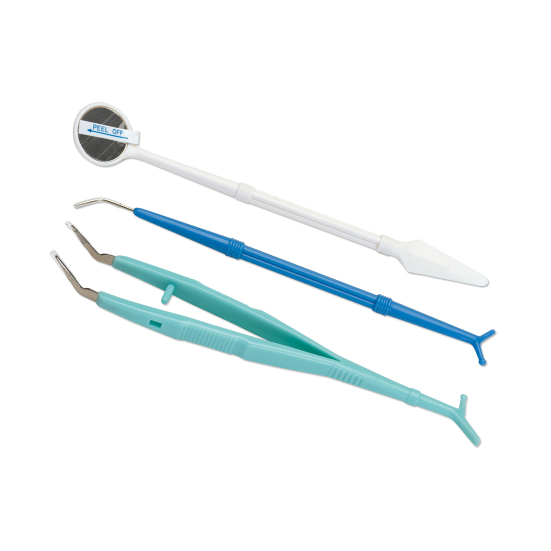 Kit contentente: specchio per la bocca, pinzette e sonda, spatola di miscelazione grande per miscelare cemento e materiali di riempimento.
