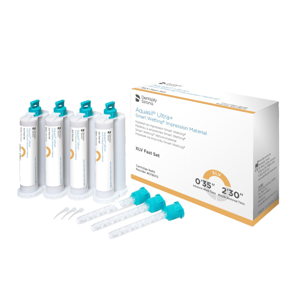 Confezione 4 cartucce da 50 ml cad + 12 puntali miscelatori verdi + 12 terminali intraorali bianchi.
