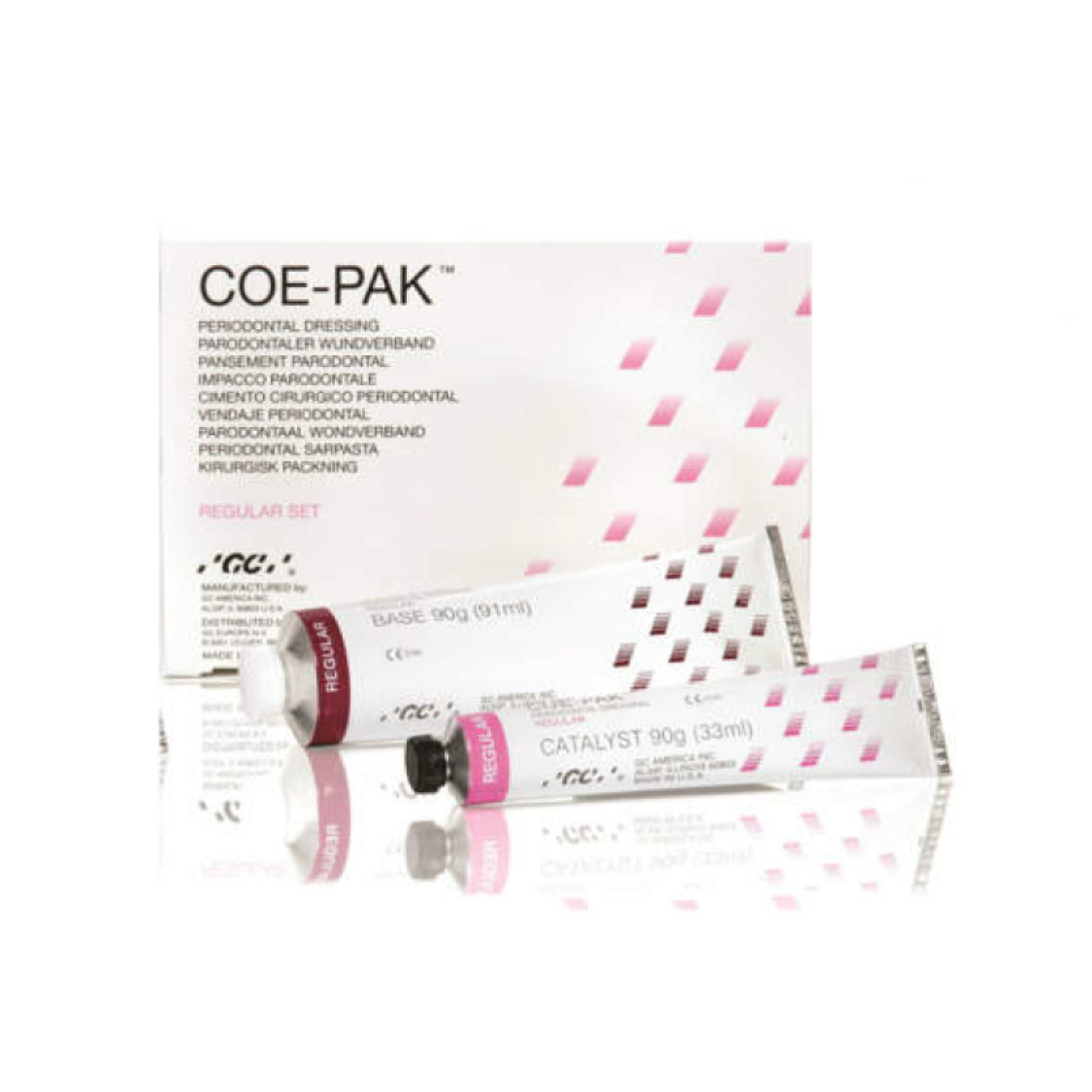 Coe Pak è un rivestimento parodontale per medicazioni chirurgiche, privo di eugenolo e amianto. Per la prevenzione nel lavoro chirurgico con una resistenza elastica che non gli permette di rompersi e non consente alle punte taglienti o ai bordi scalfiti di lacerare i tessuti. Poiché non contiene eugenolo, non brucia i tessuti sensibili della bocca, né produce un odore o un sapore sgradevole. È resistente e non si deteriora nelle normali condizioni di conservazione. Una volta mescolato, può essere modellato nella forma desiderata facilmente, poiché perde la viscosità in 2-3 minuti e può essere lavorato per 10-15 minuti.