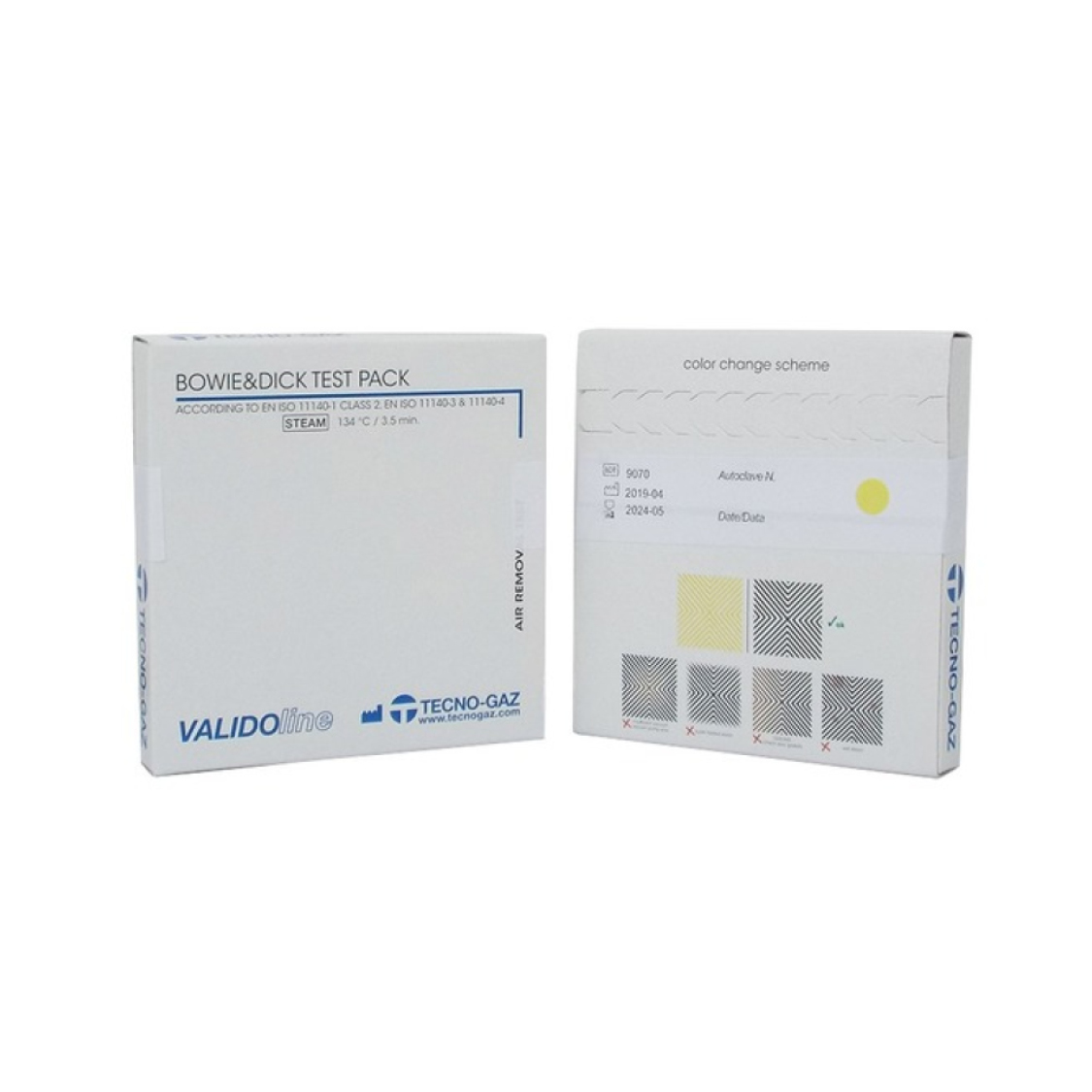 Test di Bowie & Dick per il controllo del funzionamento delle autoclavi a vapore con vuoto singolo o frazionato. Verifica il livello di vuoto e la penetrazione del vapore. Fornisce risposta equivalente ai risultati otte- nuti con il pacco test standard previsto dalla EN 285.