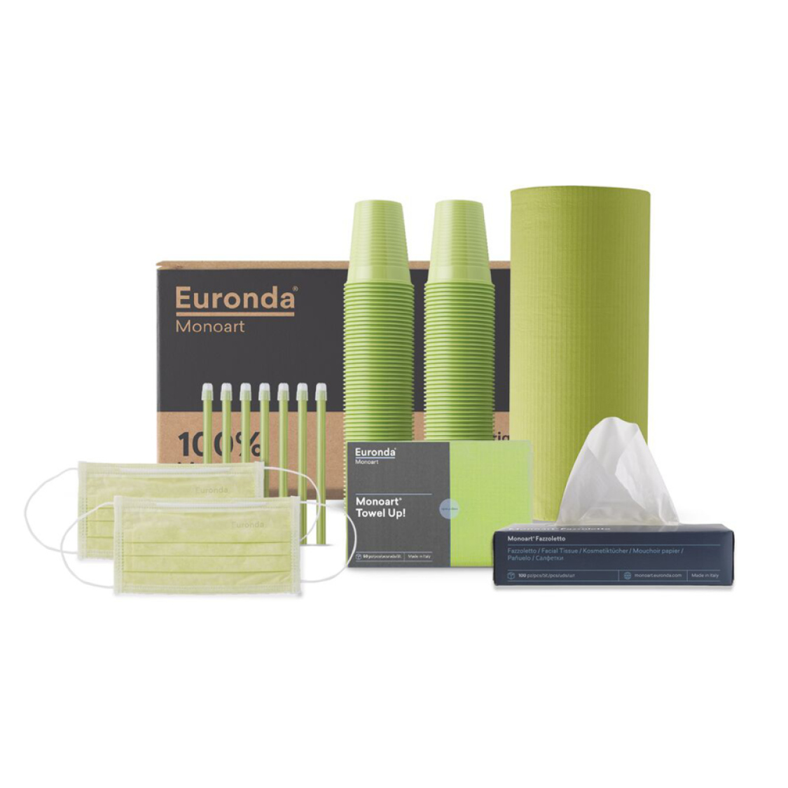 Monoart Salvietta Towel Up! (100 pz), Monoart Aspirasaliva (sacchetto da 100 pz), 100 Monoart Bicchiere in plastica, 100 Monoart Mascherina Protection 3, 100 Monoart Fazzoletto e 1 Monoart Mantellina PG30 (rotolo da 80 strappi).