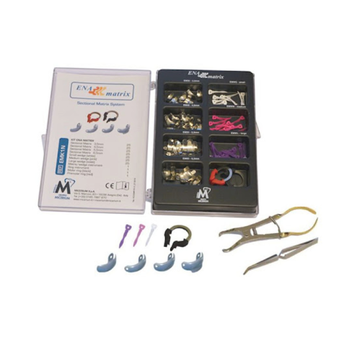 Confezione Trial Kit: 40 matrici con creste marginali (10 per ciascuna misura 3.5 mm, 4.5 mm, 5.5 mm, 6.5 mm) + 30 cunei in legno (10 per ciascuna misura Small, Medium, Large) + 1 pinza con perno per matrici e cunei + 1 pinza per applicazione anelli + 1 anello per molari.
