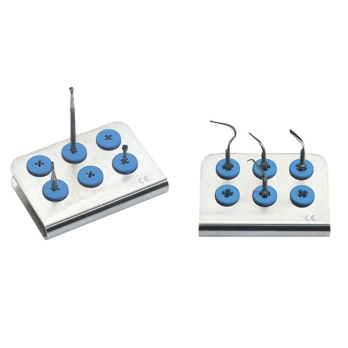 Supporto in acciaio inox con 6 fori rivestiti in silicone che si adatta a frese da un Ø minimo di 2 mm a un massimo di 5 mm. Indicato per frese chirurgiche e inserti per ablatore. Misura 4,5 x 4,9 cm.
