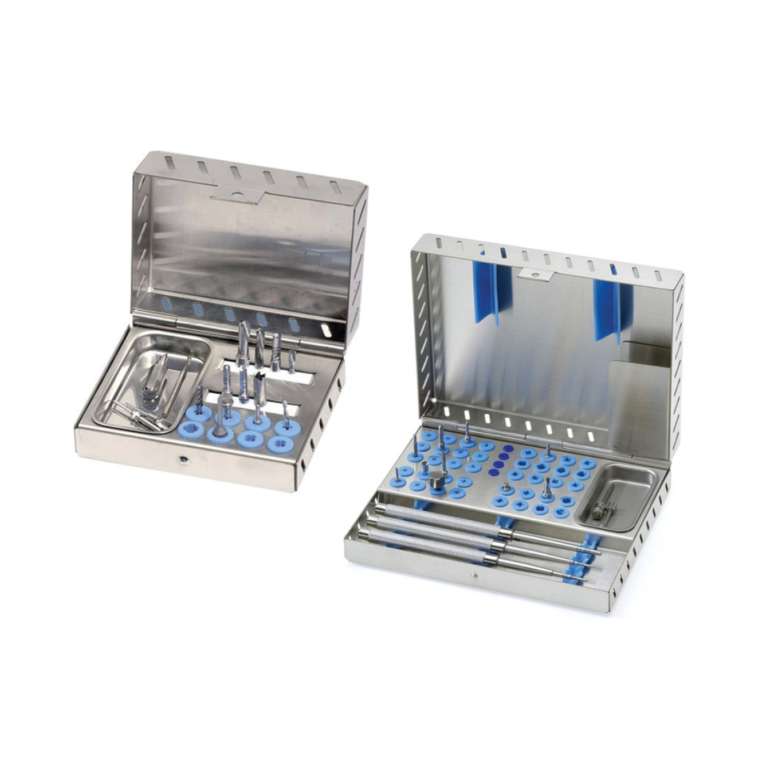 In acciaio inox con coperchio a cerniera, supporti in teflon per frese e con supporti adattabili in silicone di 3 diverse misure, atti a contenere piccoli accessori e maschiatori di diametri diversi. Utili per la preparazione di set chirurgici anche grazie alla possibilità di riporre accessori nella vaschetta in dotazione.
