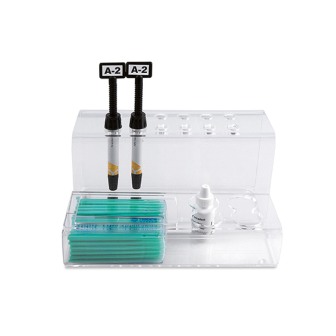 Organizzatore in plexiglass per conservazione materiale di otturazione, con 12 fori per siringhe, 4 scomparti per flaconi e base per applicatori.