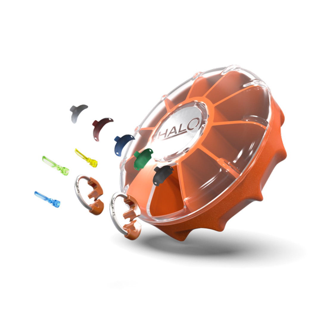 Confezione Mini Kit: 2 anelli universali + 5 matrici di ciascuna dimensione (3,5 + 4,5 + 5,5 + 6,5 + 7,5 mm) + 5 cunei di ciascuna dimensione (S, M, L) + 1 organizer Halo.