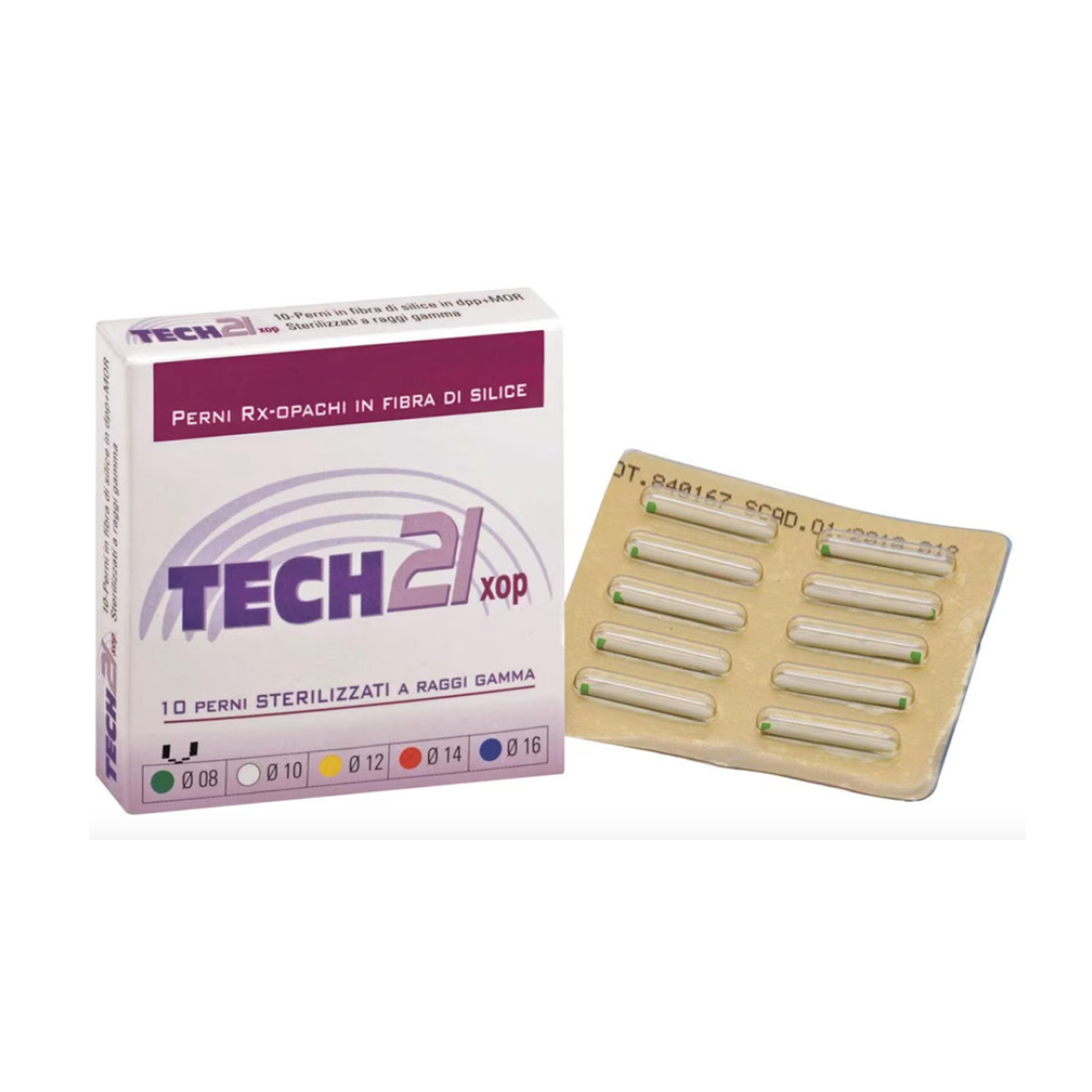 Perni in fibra di silice cilindro-conici ad alta radiopacità, indicati per la ricostruzione di denti trattati endodonticamente. I perni si presentano in colorazione bianca e sono altamente radiopachi. Le fibre di silice, inglobate in una speciale miscela di resine trattate con adesivi a base di MDP, creano un forte legame con i materiali compositi da restauro e rispettivi adesivi. Questa caratteristica consente al perno di rendere più stabile la ricostruzione e di rinforzare le radici del dente rese fragili dal trattamento endodontico. Modulo di elasticità pari a quello della dentina. Confezionati singolarmente in blister e sterilizzati, garantiscono praticità d´uso, igiene e sicurezza. Disponibili in 5 diametri codificati con colori diversi (08 verdi - 10 bianchi - 12 gialli - 14 rossi - 16 blu). Lunghezza 20mm.
