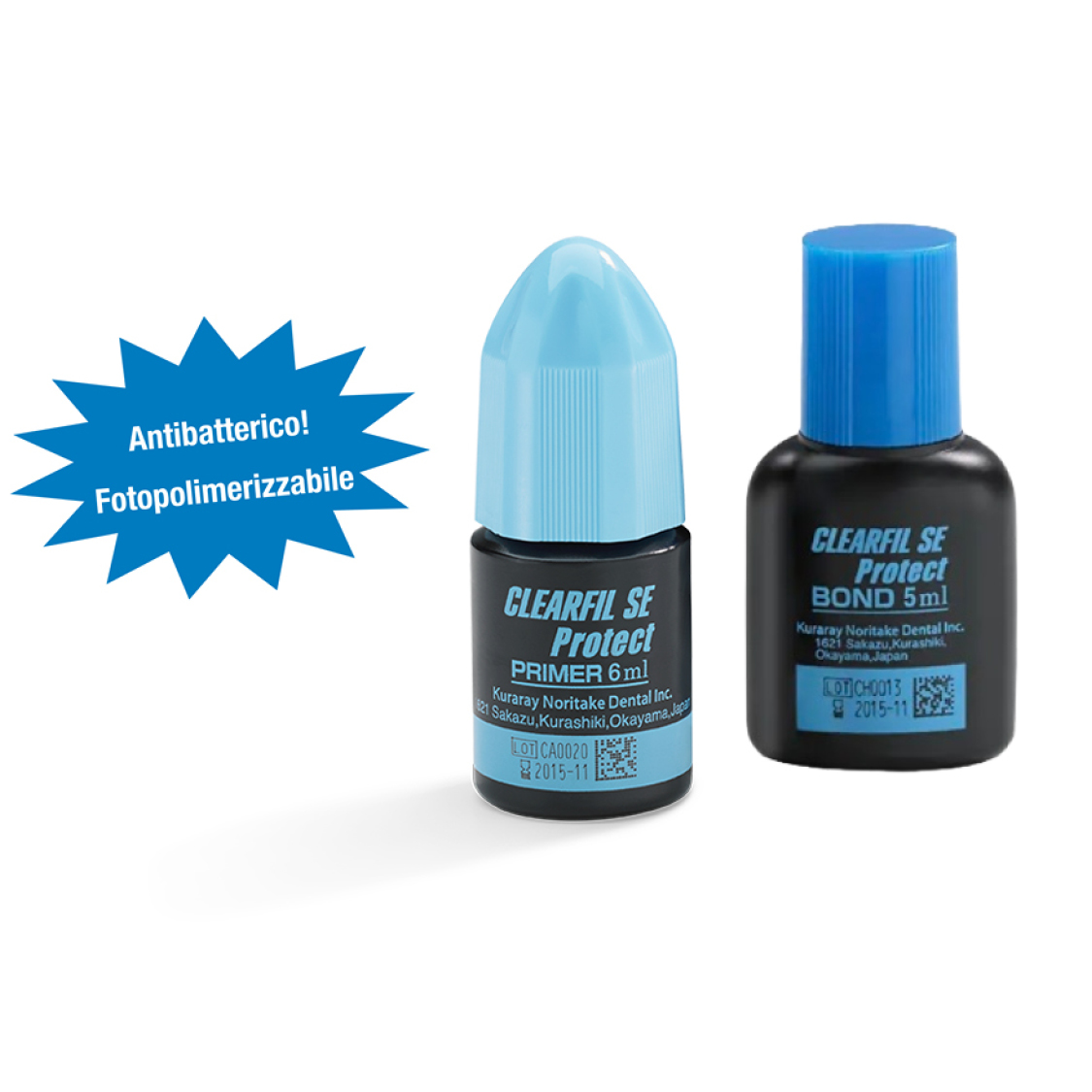 CLEARFIL™ SE Protect è un rivoluzionario adesivo self-etch antibatterico a due passaggi. E' stato sviluppato sulla base di due tecnologie: il rilascio a lungo termine di fluoro e la pionieristica molecola MDPB di casa Kuraray. Tale monomero elimina i batteri presenti e ha, quindi, un effetto antibatterico "sterilizzante" della cavità, a protezione dell'interfaccia adesiva con il composito. L'effetto antimicrobico della molecola MDPB è biologicamente sicuro perchè il monomero è fissato all'interno dello strato adesivo. Inoltre, miscelando l'adesivo con l'attivatore CLEARFIL™ DC Activator, il sistema adesivo diventa autopolimerizzante, rendendo così possibile l'impiego di CLEARFIL™ SE Protect anche per la cementazione adesiva e per la ricostruzione dei monconi.