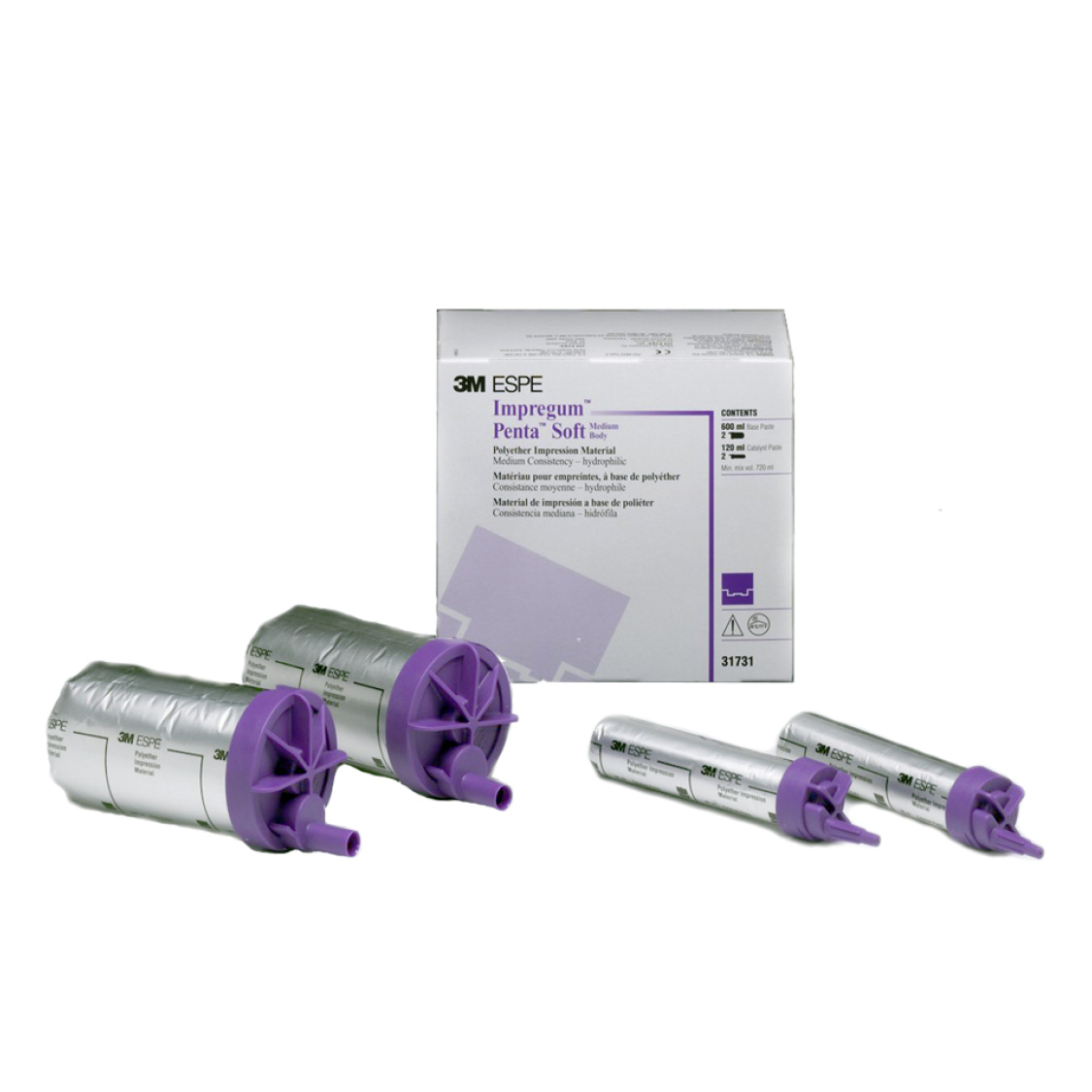 Nuovo materiale per impronte di precisione a viscosità media, Impregum Penta Soft è a base di polieteri. Indicato per tecniche d'impronta monofase (1 tempo, 1 viscosità) per corone, ponti, inlay e onlay. Tempo di lavoro: 2 min. 45 sec. Tempo di presa in bocca: 3 min. 5 sec. Tempo di presa totale: 6 min.