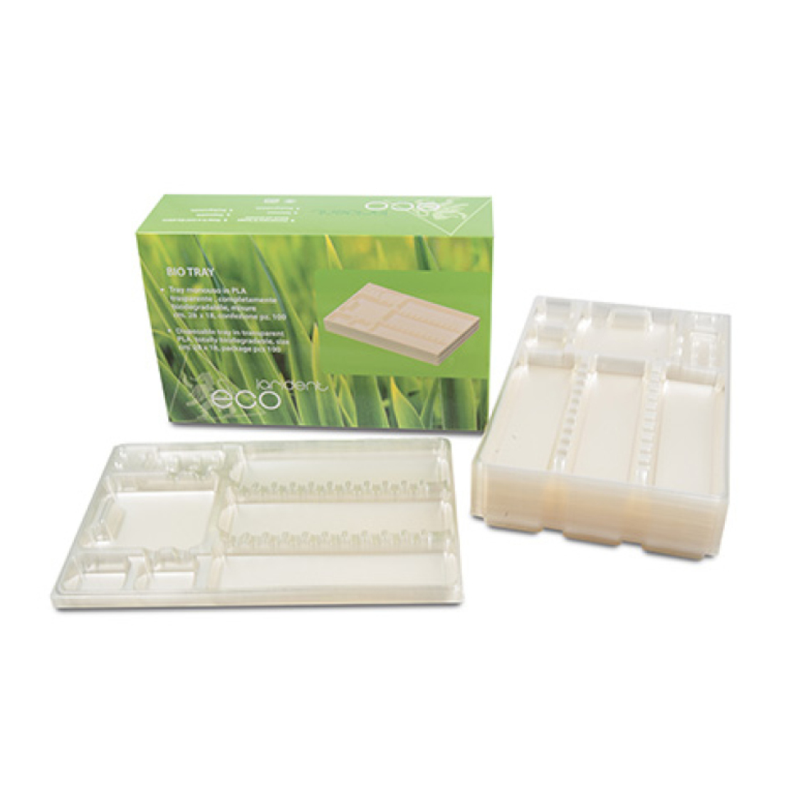 Tray monouso in PLA, polimero di origine vegetale (derivato dall’amido di mais) biodegradabile. Alta resistenza e colorazione trasparente. Misure: 18 x 28 cm.