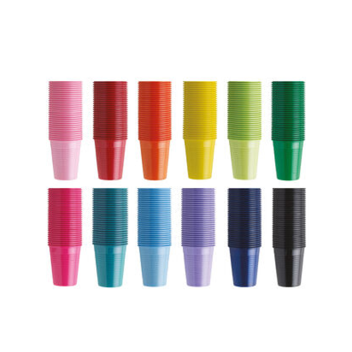 Pratico mix composto da 3.000 bicchieri (500 in 5 file da 100) in 6 varianti colore: giallo, arancione, blu, rosa, lilla, lime.