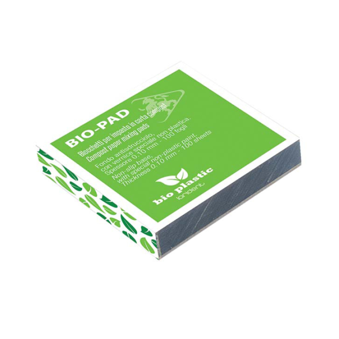 Blocchetto completamente BIO in carta accoppiata con Bio cartene (plastica bio-based). Colore dei fogli bianco. Dimensione 7×8 cm. Composto da 100 fogli spessore 0,10 mm. Base antisdrucciolo con vernice speciale non plastica.