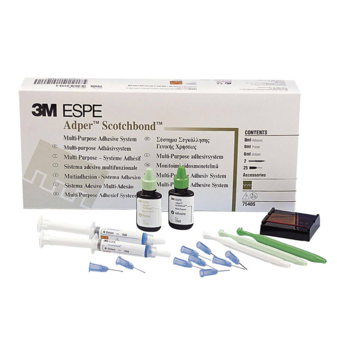 Confezione 1 adesivo da 8 ml + 1 primer da 8 ml + 1 mordenzante (acido fosforico 35 %) in 2 siringhe da 3 ml cad. + accessori.