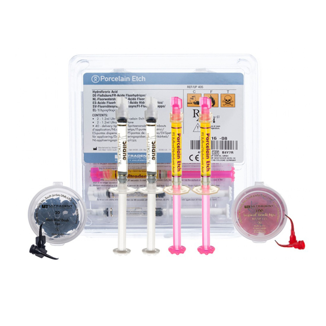 Confezione 2 siringhe Porcelain Etch da 1,2 ml cad. + 2 siringhe Silano da 1,2 ml cad. + 40 Tips.